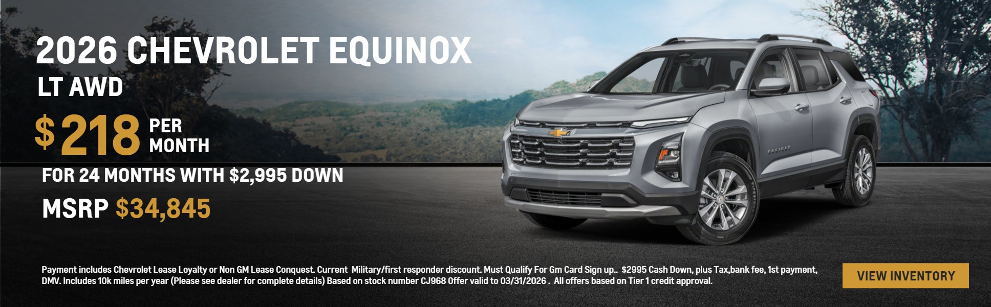 Payment includes Chevrolet Lease Loyalty or Non GM Lease Conquest. Current Military/first responder discount. Must Qualify For Gm Card Sign up.. $2995 Cash Down, plus Tax,bank fee, 1st payment, DMV. Includes 10k miles per year (Please see dealer for complete details) Based on stock number CJ968 Offer valid to 03/31/2026 . All offers based on Tier 1 credit approval.