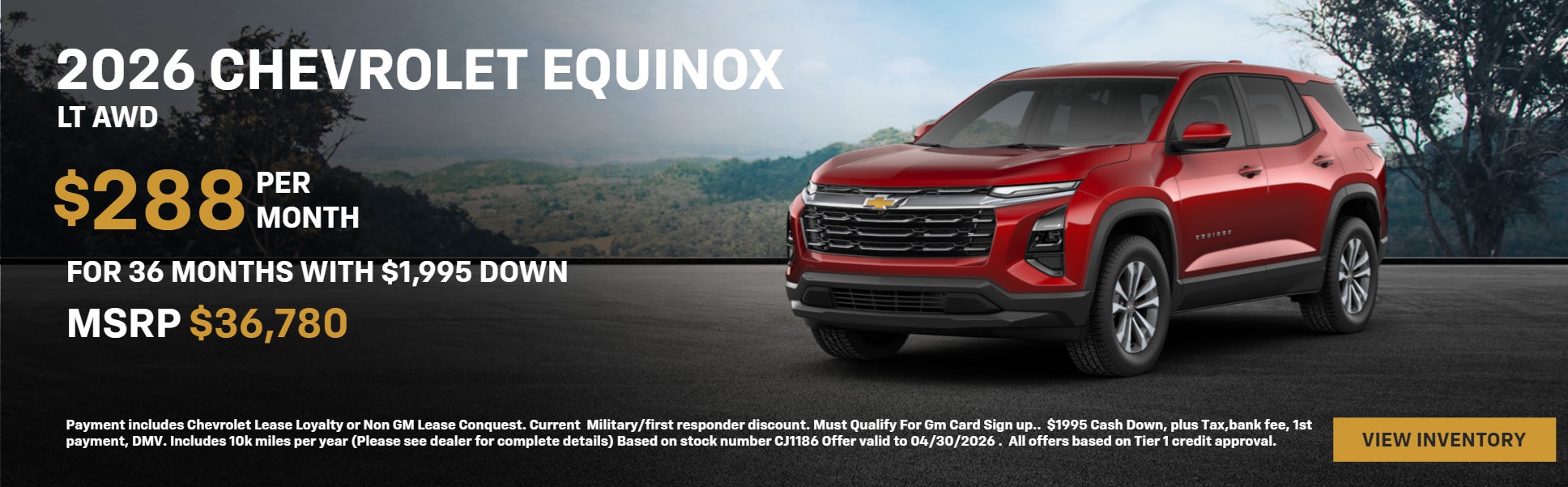 Payment includes Chevrolet Lease Loyalty or Non GM Lease Conquest. Current Military/first responder discount. Must Qualify For Gm Card Sign up.. $1,995 Cash Down, plus Tax,bank fee, 1st payment, DMV. Includes 10k miles per year (Please see dealer for complete details) Based on stock number CJ1186 Offer valid to 04/30/2026 . All offers based on Tier 1 credit approval.